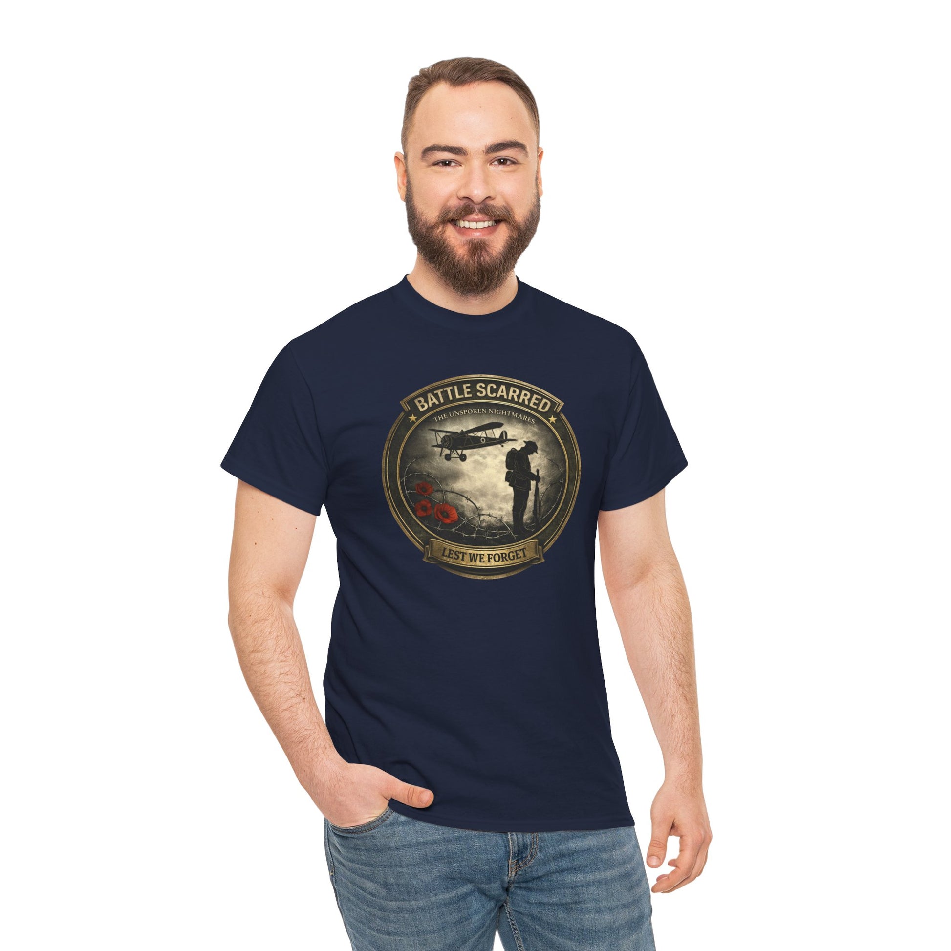“Lest We Forget” honours those who gave everything, and those who came home carrying memories they never asked to keep. The poppies represent sacrifice, the silhouette represents survival, and the silence represents what many veterans live with every day.
